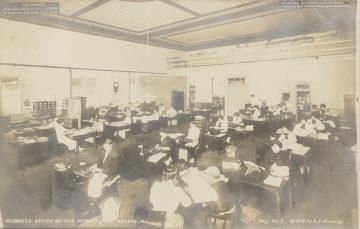 Illustrierte Postkarte; Fotografie, monochrom; Neg. No. 3 Rückseite: Ansicht eines Großraum-Schreibbüros, männliche und weibliche Mitarbeiter mit Schreibmaschinen Vorderseite: beschrieben; adressiert an Miss Patton, Bowers Mills; Briefmarke U.S. Postage 1 Cent; Poststempel Stotts City/Apr 30 1913