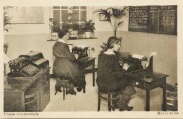 Illustrierte Postkarte; Fotografie, monochrom Rückseite: zwei Frauen/Schülerinnen in einem Unterrichtsraum mit Schreibmaschinen Vorderseite mit Beschreibungstext: Les Religieuses Ursulines - Lierre; nicht beschrieben