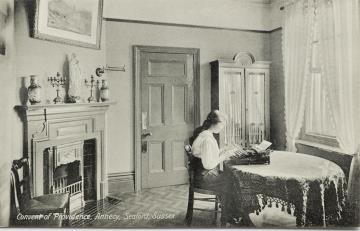 Illustrierte Postkarte; Fotografie, monochrom; Nr. 13 29216 Rückseite: Schreibzimmer mit Kamin; Frau mit Schreibmaschine Vorderseite nicht beschrieben