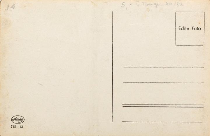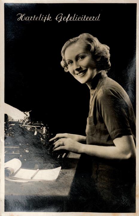 Illustrierte Postkarte; Fotografie, monochrom; Nr. 715 13 Rückseite: Frau mit Schreibmaschine, Blick zum Betrachter Vorderseite nicht beschrieben