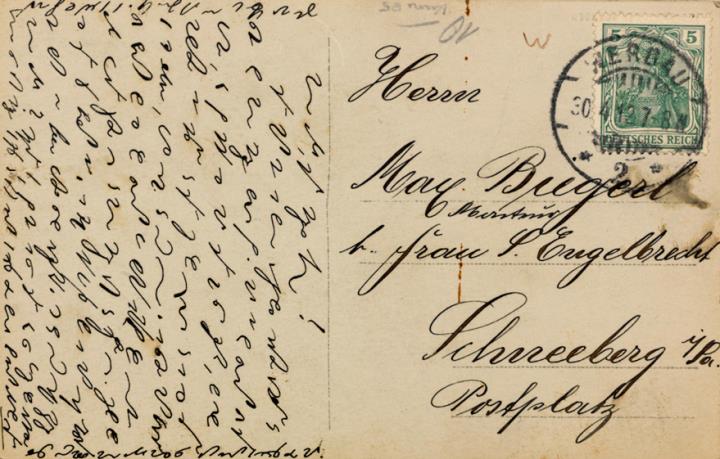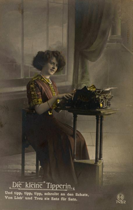 Illustrierte Postkarte; Fotografie, koloriert; Serie LL 749/2 Rückseite: Frau mit Schreibmaschine, Text in Versform Vorderseite: in Stenografie beschrieben; adressiert an Herrn Biegerl, Schneeberg; Briefmarke Deutsches Reich 5 Pf.; Poststempel Werdau/30.4.1912