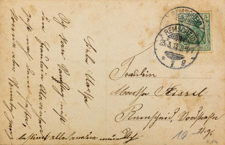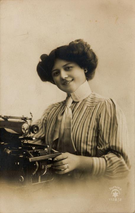 Illustrierte Postkarte; Fotografie, monochrom; Serie Fortuna 1728/2 Rückseite: Frau mit Schreibmaschine, Blick zum Betrachter Vorderseite: beschrieben; adressiert an Fräulein (H)Eissel, Remscheid; Briefmarke Deutsches Reich 5 Pf.; Poststempel Remscheid/23.3.1913