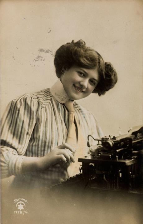 Illustrierte Postkarte; Fotografie, koloriert; Serie Fortuna 1728/4 Rückseite: Frau mit Schreibmaschine, Blick zum Betrachter Vorderseite: beschrieben; adressiert an Mademoiselle Dornberger, Kriens; Briefmarke Helvetia 5 Rp; Poststempel Emmenbrücke/29.VI.1910