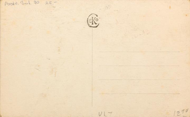 Illustrierte Postkarte; Fotografie, monochrom; Serie Ceko 1819 Rückseite: Frau mit Schreibmaschine, Blumen als Dekoration Vorderseite nicht beschrieben
