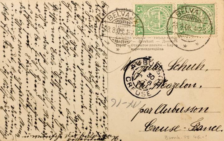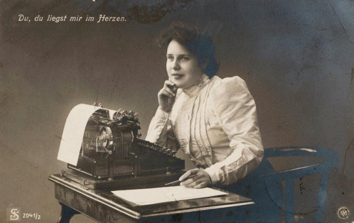 Illustrierte Postkarte; Fotografie, monochrom; Serie 2041/2 Rückseite: Frau mit Schreibmaschine Vorderseite: beschrieben, adressiert an M.lle Schuh, Creuse; Briefmarke Luxembourg 5 cent.+ 5 cent.; Poststempel Belvaux/28.8.1908