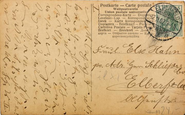 Illustrierte Postkarte; Fotografie, monochrom; Serie 2041/3 Rückseite: Frau mit Schreibmaschine Vorderseite: in Stenografie beschrieben, adressiert an Fräulein Hahn, Elberfeld; Briefmarke Deutsches Reich 5 Pf.; Poststempel Elberfeld/-7.11.1907