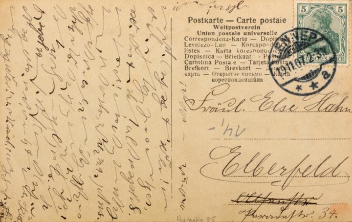 Illustrierte Postkarte; Fotografie, monochrom; Serie 2041/6 Rückseite: Frau mit Schreibmaschine, Blick zum Betrachter Vorderseite: in Stenografie beschrieben, adressiert an Fräulein Hahn, Elberfeld; Briefmarke Deutsches Reich 5 Pf.; Poststempel Elberfeld/19.11.1907