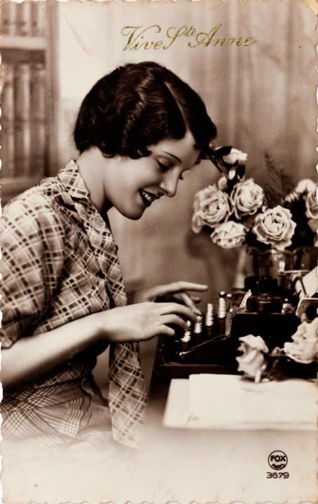 Illustrierte Postkarte; Fotografie, monochrom; Serie Fox 3679 Rückseite: Frau mit Schreibmaschine, Blumen als Dekoration Vorderseite nicht beschrieben