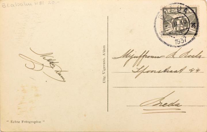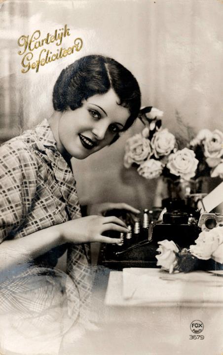 Illustrierte Postkarte; Fotografie, monochrom; Serie Fox 3679 Rückseite: Frau mit Schreibmaschine, Blick zum Betrachter, Blumen als Dekoration Vorderseite: beschrieben und adressiert; Briefmarke Nederland 11 Cent; Poststempel Breda/2.II.10 1937