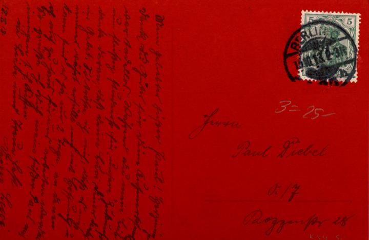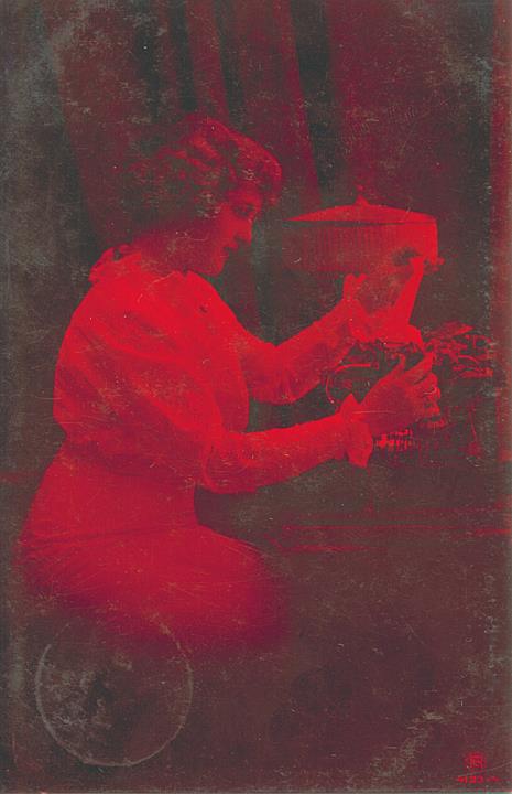 Illustrierte Postkarte; Fotografie, getönt; Serie RPH 4133/4 Rückseite: Frau mit Schreibmaschine, Tischlampe als Dekoration Vorderseite: beschrieben; adressiert an Herrn Diebel; Briefmarke Deutsches Reich 5 Pf., Poststempel Berlin/15.10.1913
