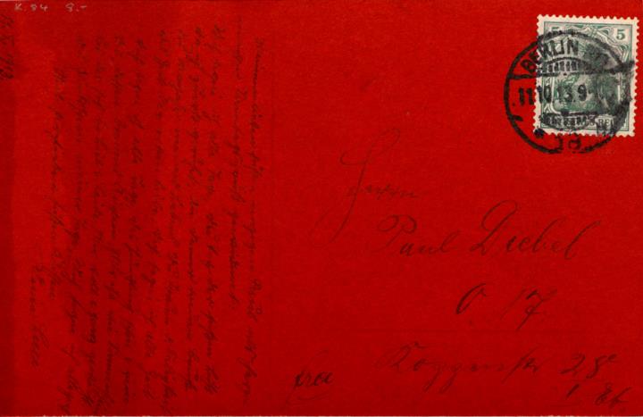 Illustrierte Postkarte; Fotografie, getönt; Serie RPH 4133/5 Rückseite: Frau mit Schreibmaschine, Blick zum Betrachter, Tischlampe als Dekoration Vorderseite: beschrieben; adressiert an Herrn Diebel; Briefmarke Deutsches Reich 5 Pf., Poststempel Berlin/11.10.13 1918