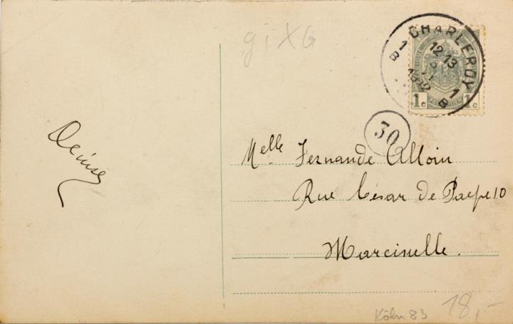 Illustrierte Postkarte; Fotografie, monochrom; Serie BNK 33900/3 Rückseite: Frau mit Schreibmaschine Vorderseite: beschrieben; adressiert an M.lle Alloin, Marcinelle; Briefmarkte Postes Belgique 1c; Poststempel Charleroy/12.13 xx 1912