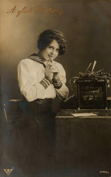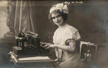 Illustrierte Postkarte; Fotografie, monochrom; Serie BNK 33900/1 Rückseite: Frau mit Schreibmaschine, Blick zum Betrachter Vorderseite: beschrieben; adressiert an Madame L'hoest, London; Briefmarke Postage Revenue (U.K.) Half Penny; Poststempel Eastbourne/1 Apr 1915