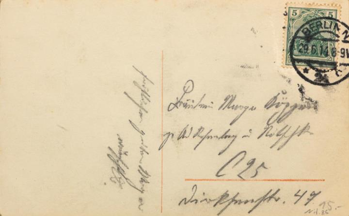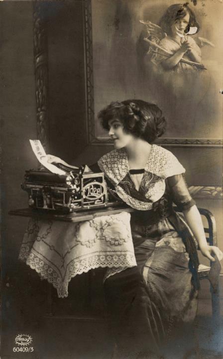Illustrierte Postkarte; Fotografie, monochrom; Nr. 60409/3 Rückseite: Frau mit Schreibmaschine Ideal, darüber Kind als Engel Vorderseite: beschrieben und adressiert; Briefmarke Deutsches Reich 5 Pf.; Poststempel 29.06.1914