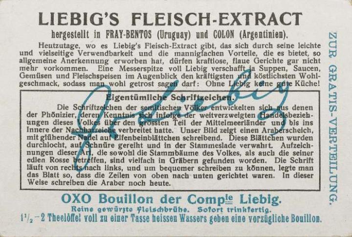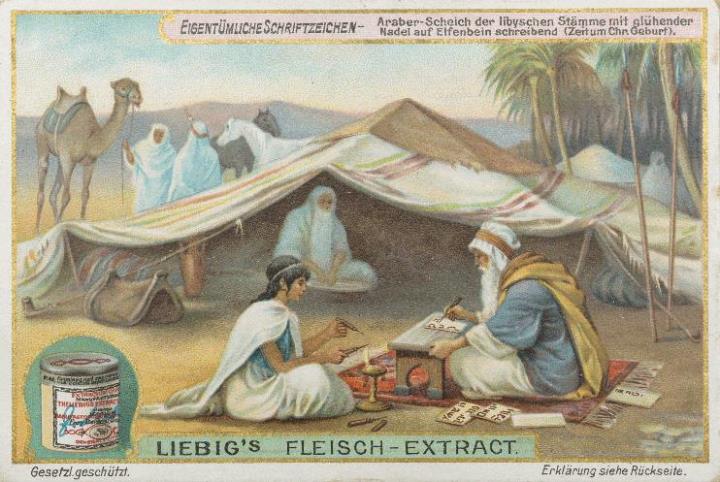Reklamesammelbild (Liebig's Fleisch-Extract); polychrom Text: Araber-Scheich der libyschen Stämme mit glühender Nadel auf Elfenbein schreibend (Zeit um Chr. Geburt) Rückseite: Erläuterungstext zum Sammelbild, Werbetext zum Produkt