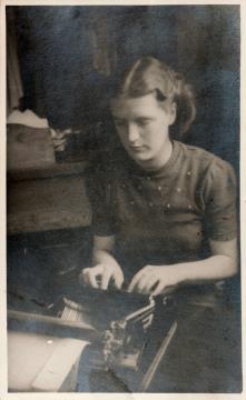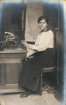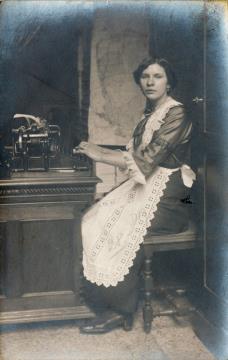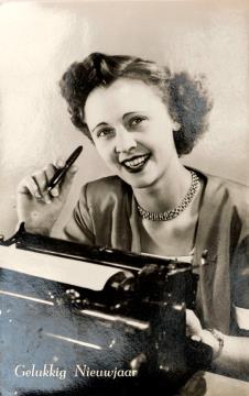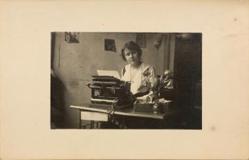 Illustrierte Postkarte; Fotografie, monochrom; Rückseite: Frau/Sekretärin mit Schreibmaschine Vorderseite nicht beschrieben vgl. Inv.Nr. P1-190