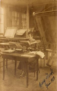 Illustrierte Postkarte mit Autogramm; Fotografie, monochrom Rückseite: Kochbuchautorin Mary Schenk mit Schreibmaschine Vorderseite: datiert 14. Juni 1919