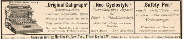 Werbeanzeige für Schreibmaschine, Vervielfältigungsapparat und Füllfeder monochrom