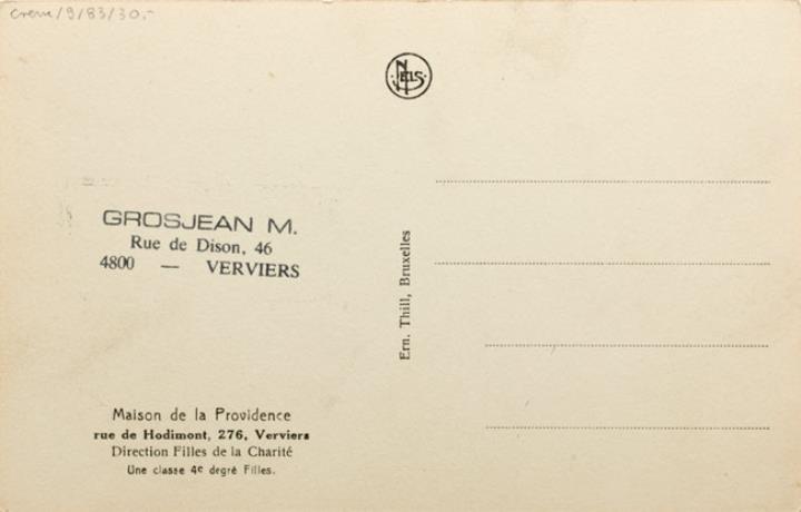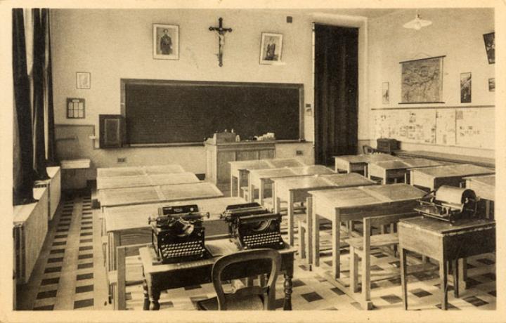 Illustrierte Postkarte; Fotografie, monochrom Rückseite: Unterrichtsraum mit Schreibmaschinen Vorderseite mit Beschreibungstext: Maison de la Providence, Verviers [...] Une classe 4e degré Filles; nicht beschrieben