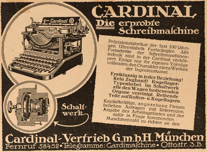 Werbeanzeige für Schreibmaschine Cardinal monochrom