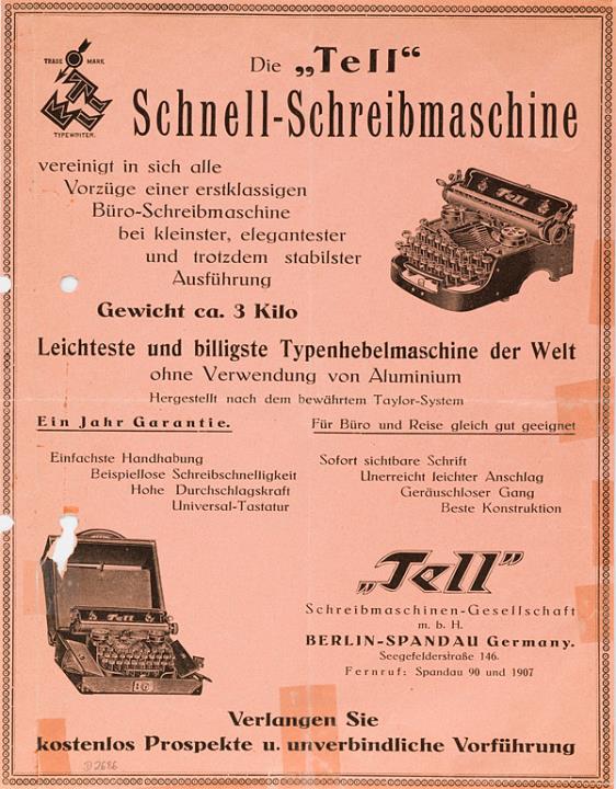 Next to literature on the history of technology, of the typewriter and the office, the Archive holds patent letters, textbooks and instruction manuals as well as historical postcards, letters, photographs and various kinds of advertising (leaflets and brochures, advertising stamps, newspaper ads, posters and signs, promotional gifts).