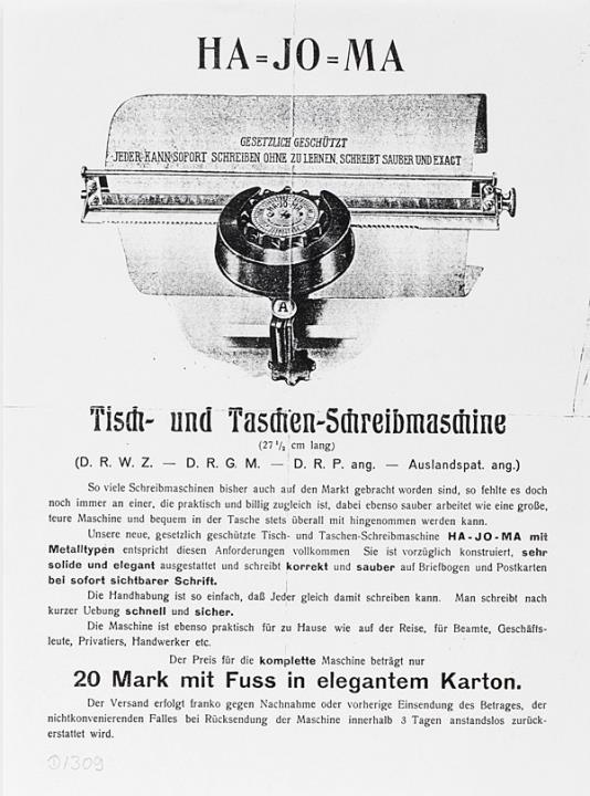 Next to literature on the history of technology, of the typewriter and the office, the Archive holds patent letters, textbooks and instruction manuals as well as historical postcards, letters, photographs and various kinds of advertising (leaflets and brochures, advertising stamps, newspaper ads, posters and signs, promotional gifts).