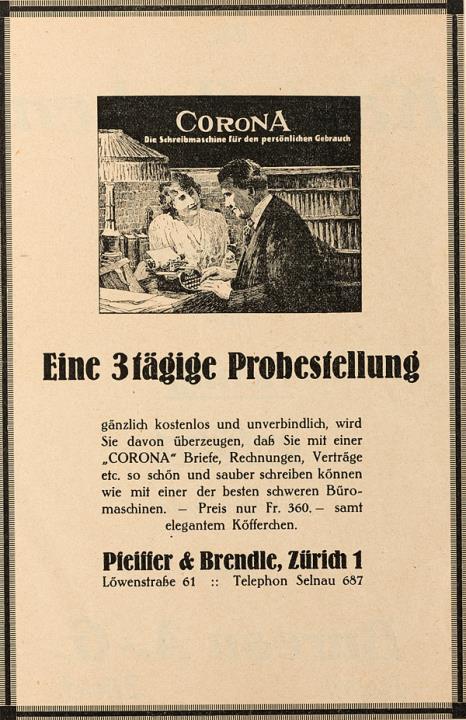Werbeanzeige für Schreibmaschine Corona monochrom