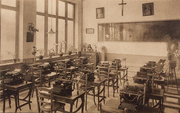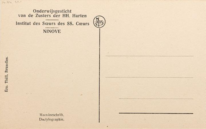 Illustrierte Postkarte; Fotografie, monochrom Rückseite: Unterrichtsraum mit Schreibmaschinen Vorderseite mit Beschreibungstext: [...] Institut des Soeurs des SS. Coeurs. Ninove. Dactylographie; nicht beschrieben