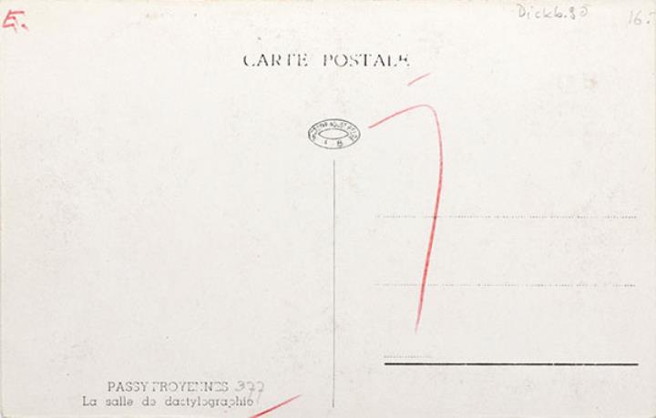 Illustrierte Postkarte; Fotografie, monochrom Rückseite: Unterrichtsraum mit Schreibmaschinen Vorderseite mit Beschreibungstext: Passy Froyennes, La salle de dactylographie; nicht beschrieben