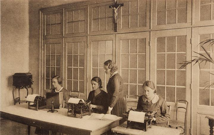 Illustrierte Postkarte; Fotografie, monochrom Rückseite: Unterrichtsraum; Schülerinnen mit Schreibmaschine und Lehrerin Vorderseite mit Beschreibungstext: Pecq - Soeurs de la Divine Providence [...] Section commerciale; nicht beschrieben
