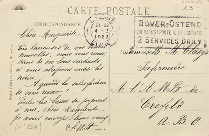 Illustrierte Postkarte; Fotografie, monochrom Rückseite: Unterrichtsraum; Lehrerin und Schülerinnen mit Schreibmaschine, Stehtafel mit Stenografiezeichen Vorderseite: beschrieben; adressiert an Mademoiselle Clayes, Crefeld; Poststempel Liege/4 I 1923