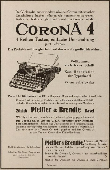 Werbeanzeige für Schreibmaschine Corona monochrom