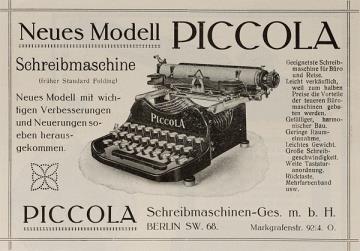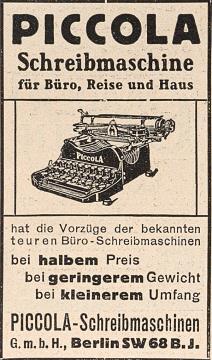 Werbeanzeige für Schreibmaschine Piccola (Corona) monochrom