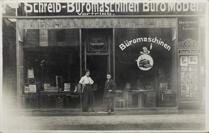 Illustrierte Postkarte; Fotografie, monochrom Rückseite: Außenansicht Schreib-Büromaschinen- und Büromöbelvertrieb Hugo Schroeder; zwei Personen posieren an der Eingangstür, Seitenauslage mit Fotografien (Oscar Roloff) Vorderseite beschrieben