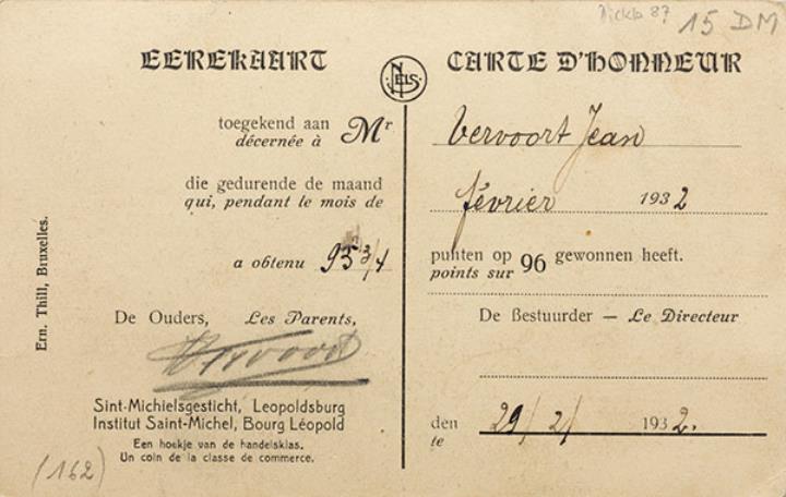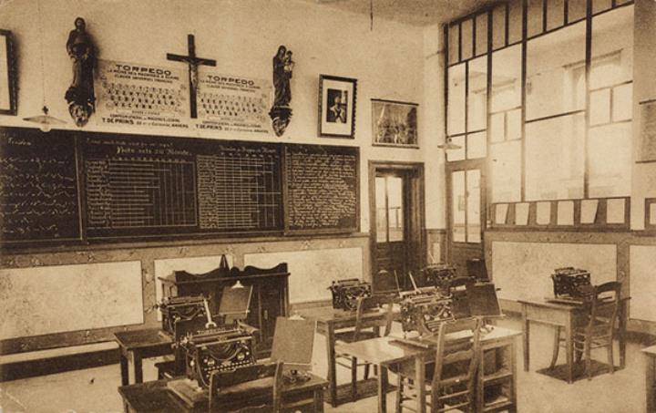 Illustrierte Postkarte (Ehrenkarte); Fotografie, monochrom Rückseite: Unterrichtsraum mit Schreibmaschinen Torpedo und aufgehängten Tastaturschautafeln Vorderseite mit Beschreibungstext: Institut Saint-Michel, Bourg Léopold. Un coin de la classe de commerce; vorgedruckter Text hinsichtlich besonderer Leistung im Unterricht, handschriftlich ergänzt, datiert 29.02.1932