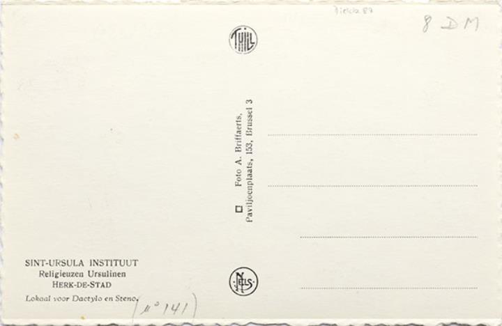 Illustrierte Postkarte; Fotografie, monochrom Rückseite: Unterrichtsraum mit Schreibmaschinen Vorderseite mit Beschreibungstext: Sint-Ursula Instituut Herk-De Stad, Lokaal voor Datylo en Steno; nicht beschrieben