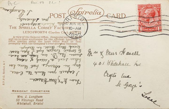Illustrierte Postkarte; Fotografie, monochrom Rückseite: Ansicht eines Großraum-Schreibbüros mit weiblichen Mitarbeitern an Schreibmaschinen Vorderseite mit Beschreibungstext: The Spirella Corset Factory Letchworth [...]; beschrieben; adressiert an Mr. & Miss Hasell, St. George; Briefmarke Postage Revenue (U.K.) One Penny; Poststempel Bristol/Jun 16 1922