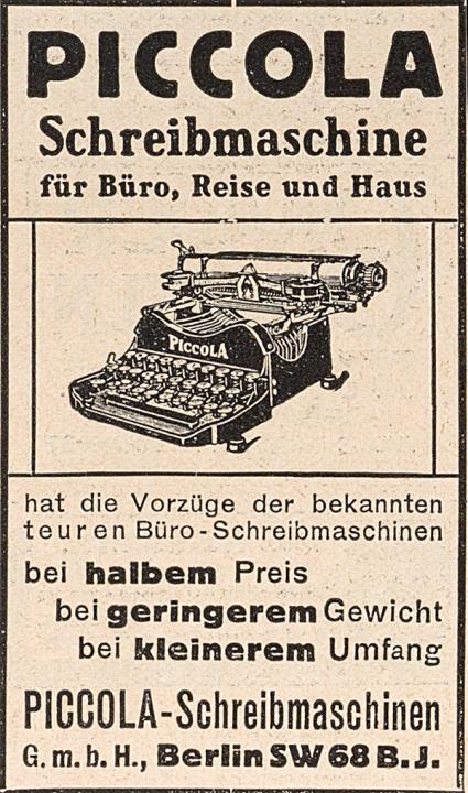 Werbeanzeige für Schreibmaschine Piccola (Corona) monochrom