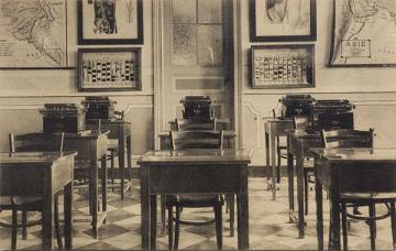 Illustrierte Postkarte; Fotografie, monochrom Rückseite: Ansicht Unterrichtsraum; Schülerinnen mit Schreibmaschine und Vervielfältigungsapparat Vorderseite: beschrieben; adressiert an Monsieur Bouffiouhe (?), Hainaut; Briefmarke Postes Belgique 15c; Briefmarke Wespelaer/9 XI 1920