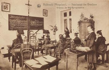 Illustrierte Postkarte; Fotografie, monochrom Rückseite: Unterrichtsraum mit Schreibmaschinen und aufgehängter Tastaturschautafel Vorderseite mit Beschreibungstext: Thildonck-Wespelaer Pensionnat des Religieuses Ursulines. Classe de Dactylographie; beschrieben; adressiert an Mejuffer Dodewijck, Meenen; Briefmarke Postes Belgique 35c; Poststempel Wespelaer/ 5 VIII 1929