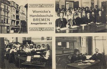 Illustrierte Postkarte; Fotocollage, monochrom Rückseite: Außenansicht, Ansicht Lehrsaal, Schreibmaschinenzimmer und Empfangszimmer der Handelsschule Wernicke Vorderseite: beschrieben; adressiert an Herrn Sander, Beckedorf Hermannsburg; Briefmarke Deutsches Reich 5 Pf.; Poststempel Bremen/22.3.1911