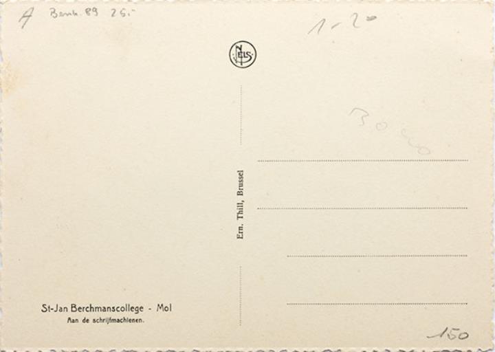 Illustrierte Postkarte; Fotografie, monochrom Rückseite: Ansicht Unterrichtsraum; Lehrer und Schüler mit Schreibmaschine Vorderseite mit Beschreibungstext: St-Jan Berchmanscollege - Mol. Aan de schrijfmachienen; nicht beschrieben