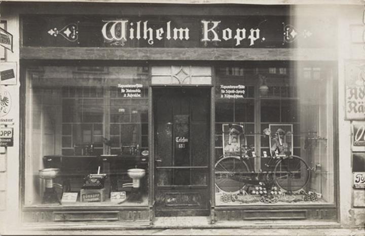 Illustrierte Postkarte; Fotografie, monochrom Rückseite: Außenansicht der Reparaturwerkstätte für Automobile & Fahrräder, für Schreib- Sprech & Nähmaschinen Wilhelm Kopp Vorderseite nicht beschrieben