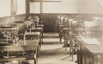 Illustrierte Postkarte; Fotografie, monochrom Rückseite: Unterrichtsraum mit Schreibmaschinen Vorderseite nicht beschrieben
