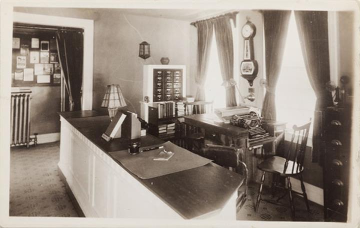 Illustrierte Postkarte; Fotografie, monochrom Rückseite: Empfangsbüro mit Schreibmaschine Vorderseite nicht beschrieben