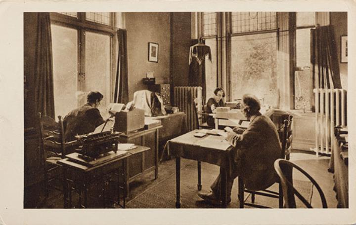 Illustrierte Postkarte; Fotografie, monochrom Rückseite: Büroansicht; männliche und weibliche Mitarbeiter an Schreibtischen; Seitentisch mit Schreibmaschine Vorderseite nicht beschrieben