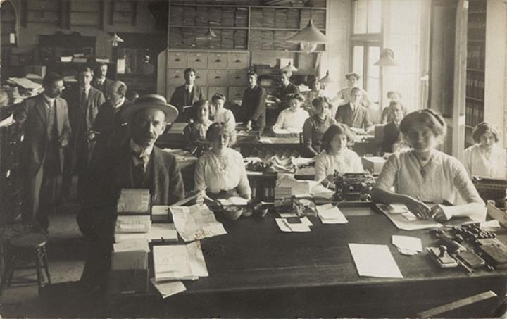 Illustrierte Postkarte; Fotografie, monochrom Rückseite: Büroansicht; männliche und weibliche Mitarbeiter (zwei mit Schreibmaschine) posieren für ein Gruppenbild Vorderseite nicht beschrieben