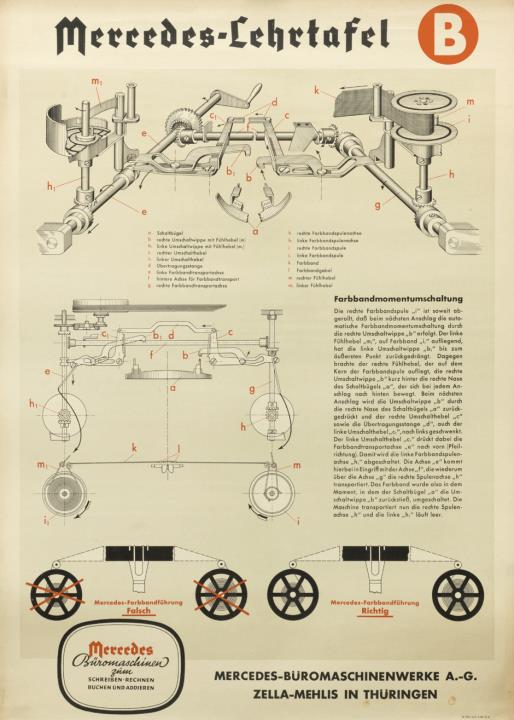 Lehrtafel mit technischer Zeichnung für Farbbandmomentumschaltung der Schreibmaschine Mercedes; Nr. W 1723 5x2.2.38.O.E. Karton mit Hängeleisten aus Metall
