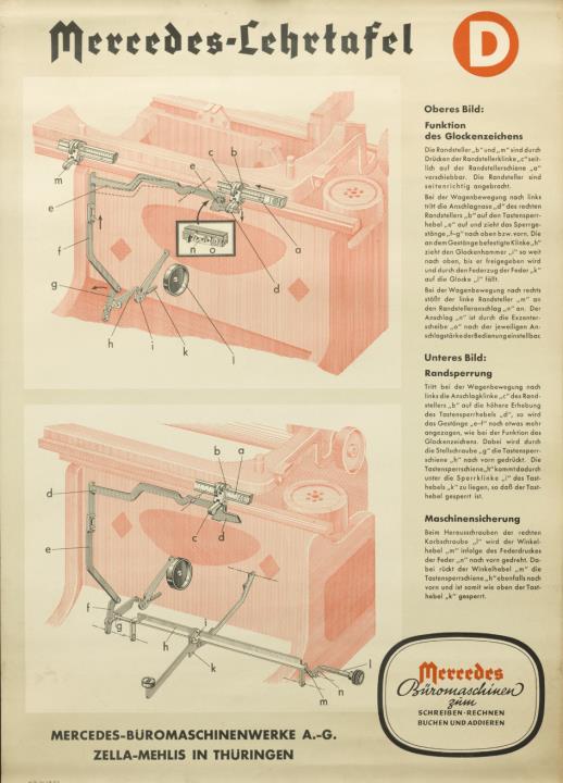 Lehrtafel mit technischer Zeichnung für Glockenzeichenfunktion, Randsperrung und Maschinensicherung der Schreibmaschine Mercedes; Nr. W 1723 5x2.2.38.O.E. Karton mit Hängeleisten aus Metall