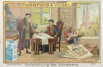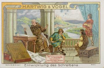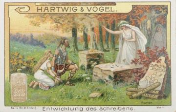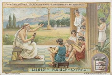 Reklamesammelbild (Liebig's Fleisch-Extract); polychrom Text: Schreiben auf Wachstafeln bei den Hellenen Rückseite: Erläuterungstext zum Sammelbild, Werbetext zum Produkt